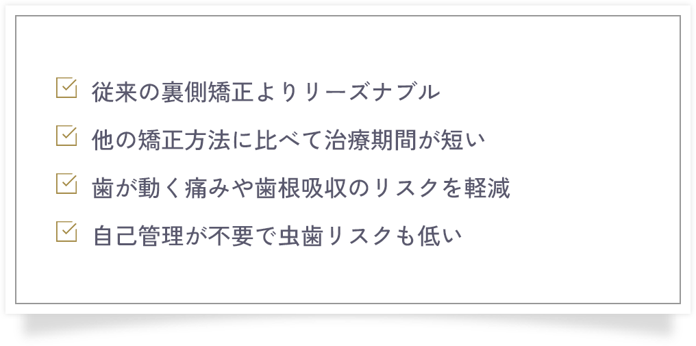 インビザラインはもちろん、良質な素材にこだわった国産のマウスピース矯正からアメリカで特許を取得した最先端の裏側矯正まで、患者様のライフスタイルやご希望に沿ったオーダーメイドな治療を提供しています。